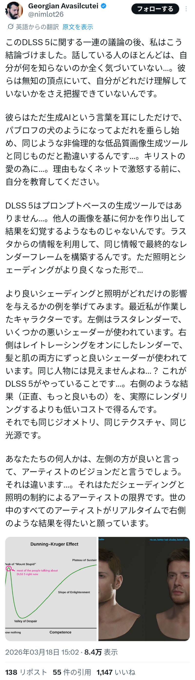 | … | 145無念Nameとしあき26/03/19(木)01:55:49No.1394819876+開発がDLSS5渡されて出てきたものがこれなんだけどつまり開発は引っ込んでろってことか |