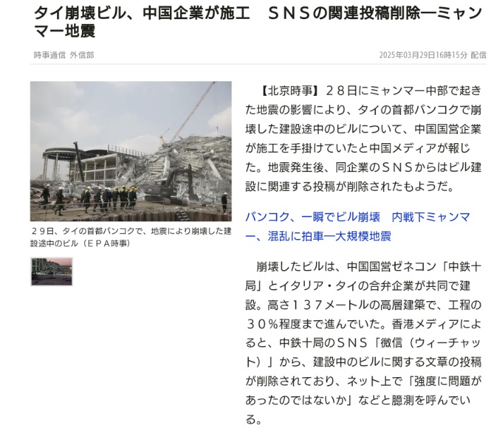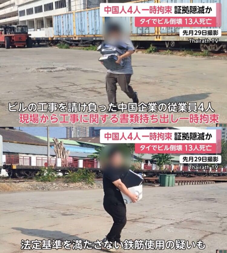 | … | 86無念Nameとしあき26/03/19(木)06:52:31No.1394831446そうだねx1>ミャンマー大地震で崩落したバンコクの高層ビルの現場から工事関連の書類を持ち出し証拠隠滅しようとした中国人ら現る |