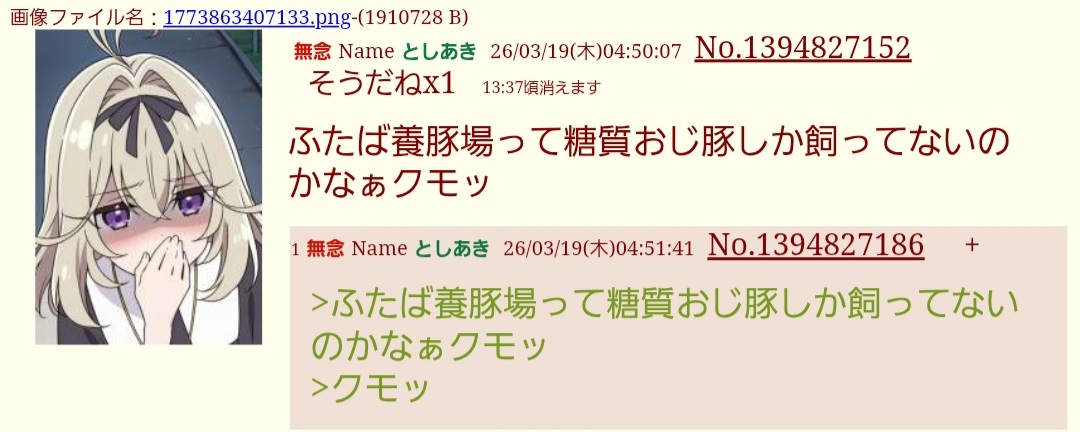 | … | 1無念Nameとしあき26/03/19(木)05:03:48No.1394827456そうだねx1>お前ら、一体何なんだよ? |