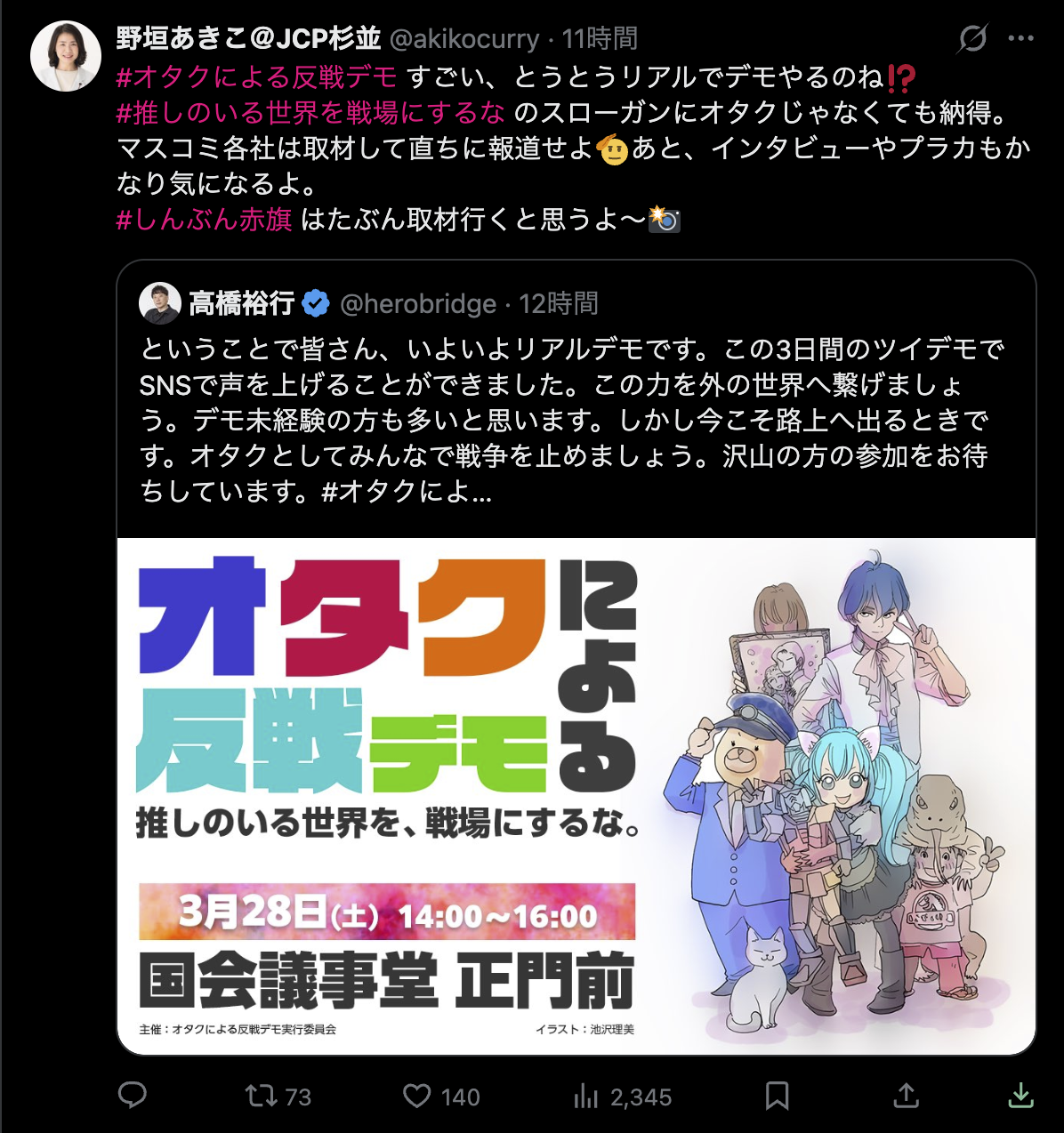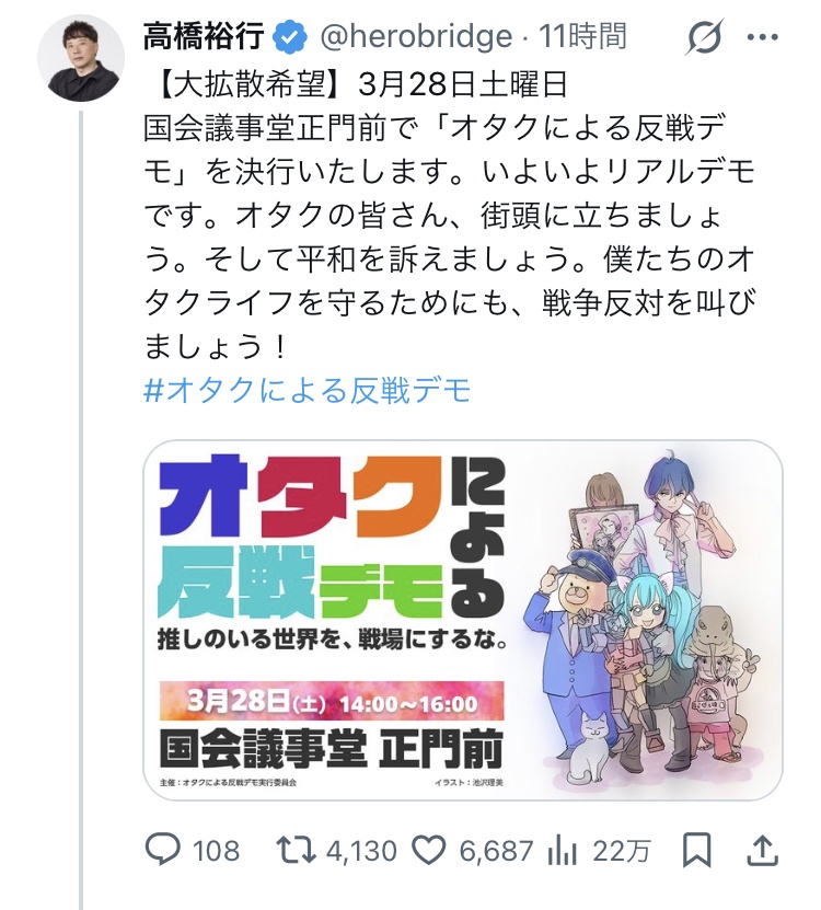 オタクによる反戦デモが来週土曜日に国会議事堂正門前で開催決定!!削除された記事が1件あります.見る