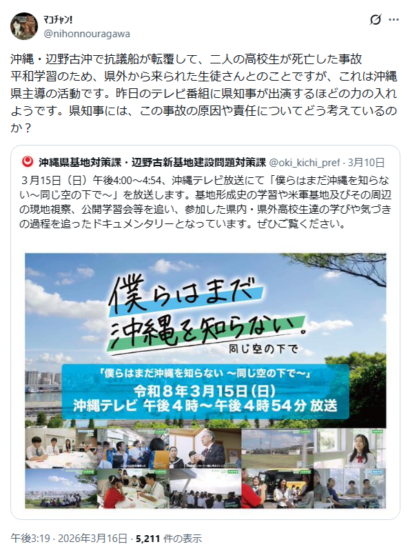 | … | 206無念Nameとしあき26/03/19(木)10:19:04No.1394851787+日本の安全保障より辺野古の話で愛国アピールするのが普通の日本人だろ? |