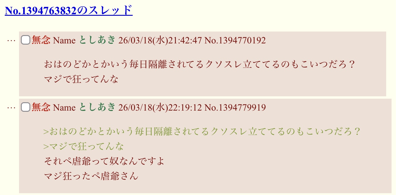 | … | 9無念Nameとしあき26/03/19(木)09:28:44 ID:xwHQ80mwNo.1394846141そうだねx6あんな糞スレでキリ番とかラストとかこだわってるのは爺一人だけで |