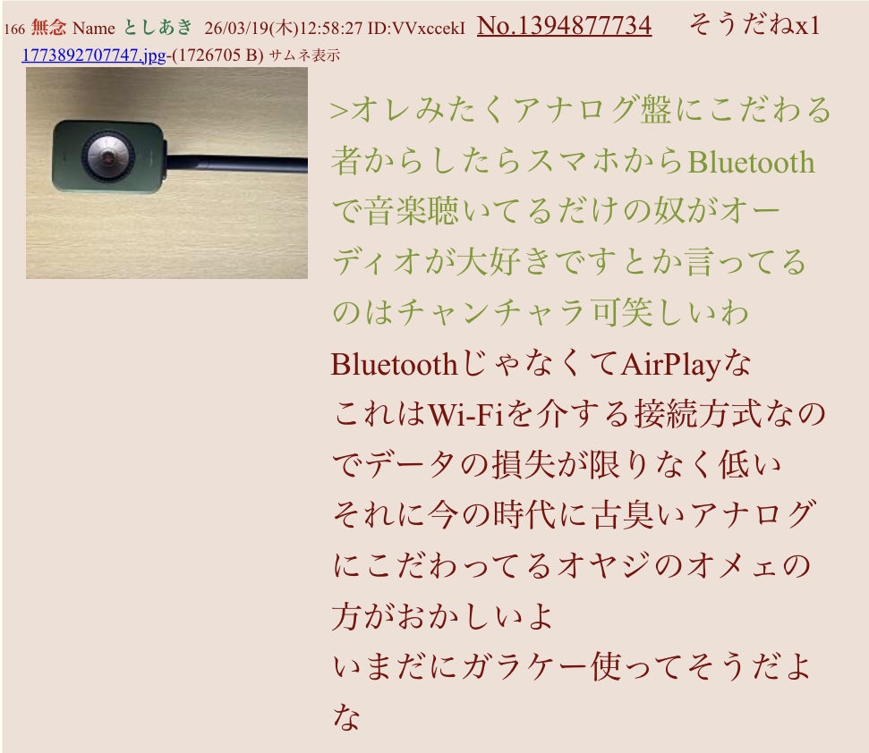 | … | 31無念Nameとしあき26/03/19(木)16:14:32No.1394909516+アナログは音質ではなく音域だけど |