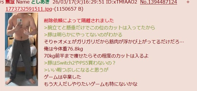 | … | 95無念Nameとしあき26/03/19(木)18:33:03No.1394935028+>脂肪落としたら50kgくらいが適正の筋量やろこれ..w |