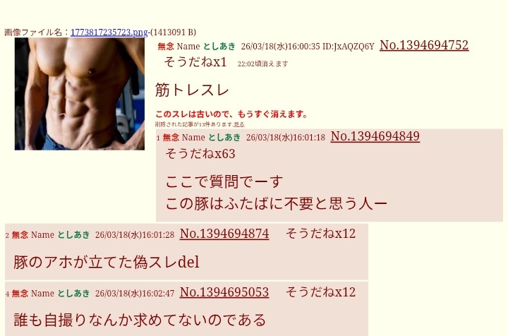 | … | 13無念Nameとしあき26/03/19(木)18:14:41No.1394931264そうだねx8一つ疑問なんだけどなんで筋トレスレでしないの? |