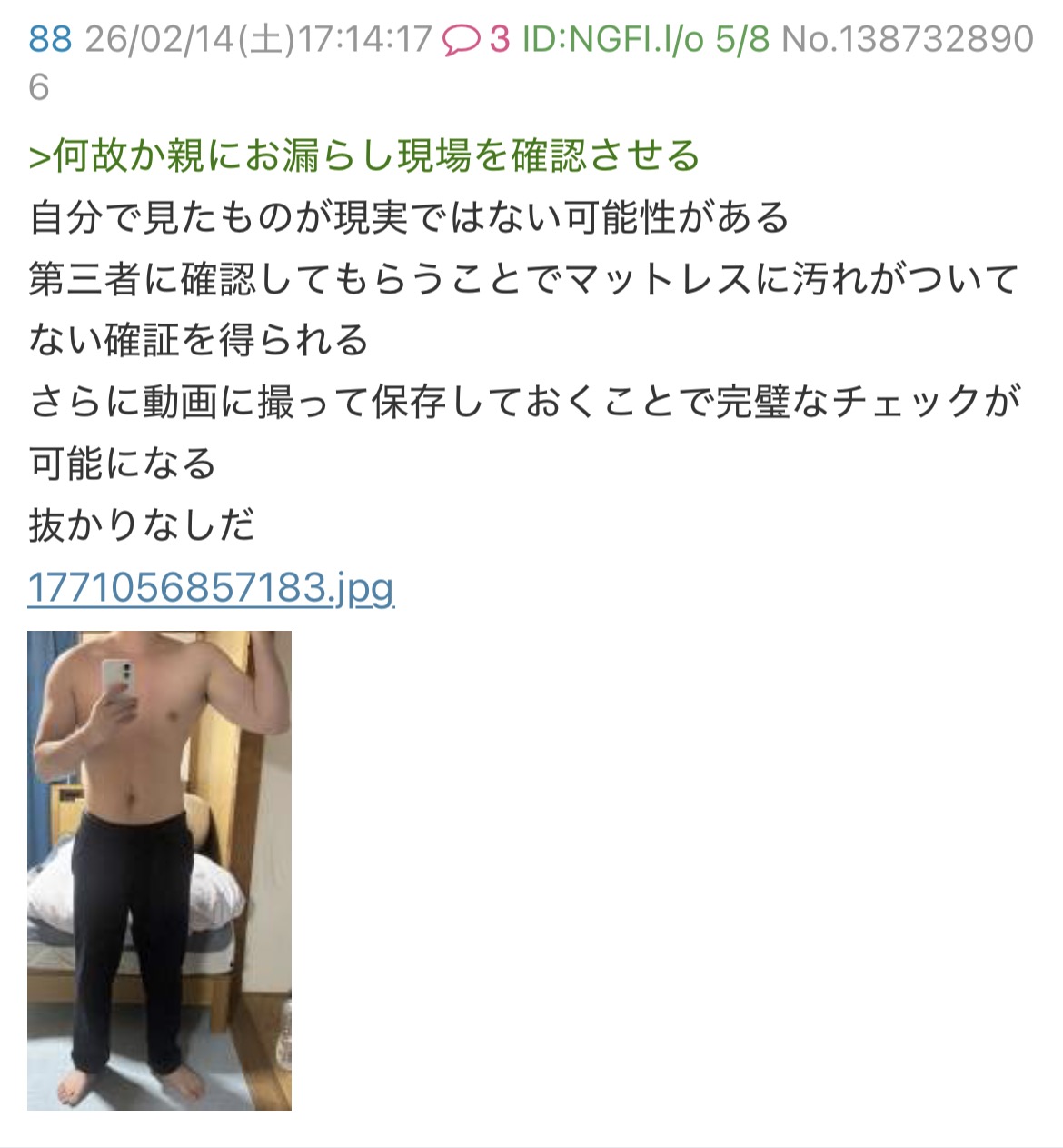 | … | 15無念Nameとしあき26/03/19(木)18:15:31No.1394931449そうだねx8 1773911731894.jpg-(144608 B) 寝小便して親に布団処分させて下着とパジャマを手洗いさせた上に |