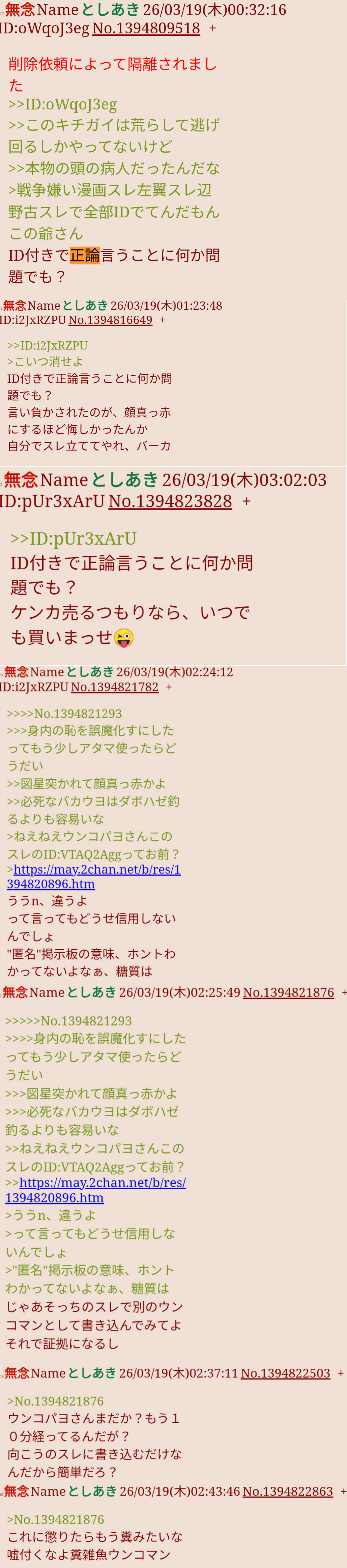 | … | 122無念Nameとしあき26/03/19(木)23:07:59No.1395006291そうだねx2>何でウヨ連呼キチガイは嘘しか言えないの? |