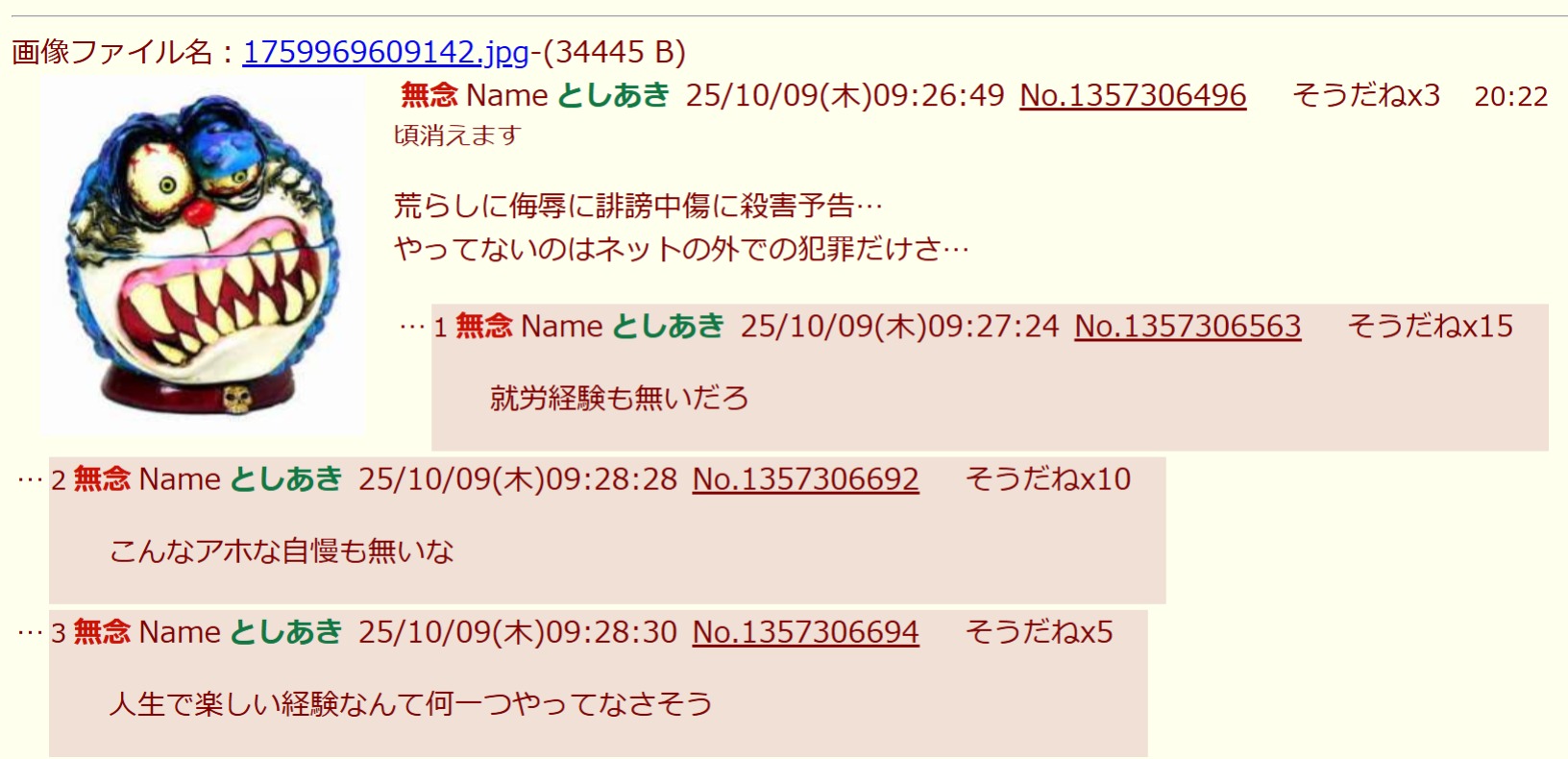 | … | 39無念Nameとしあき26/03/20(金)10:23:43No.1395073223+>この頭の悪いスレ文はなにごっこなの?キチガイ? |