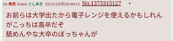 | … | 89無念Nameとしあき26/03/20(金)10:44:39No.1395076434そうだねx1>まさか精一杯見栄はって最終学歴小3にしたいだけならミジメ過ぎるが |