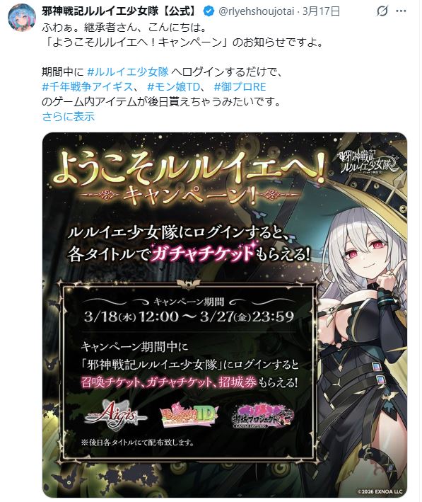 | … | 1無念Nameとしあき26/03/20(金)11:54:39No.1395088175+ 1773975279377.jpg-(101641 B) ルルイエログインで召喚チケ4枚もらえるよ |