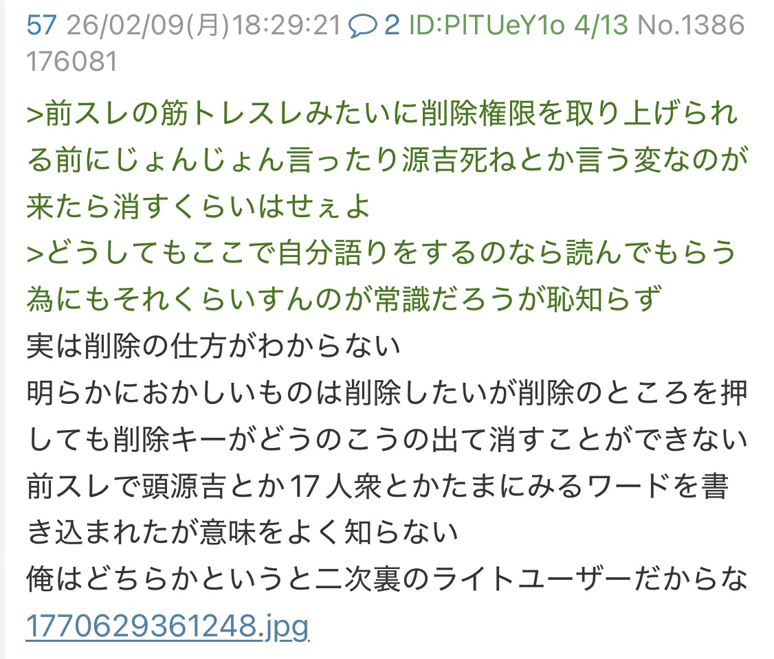 | … | 419無念Nameとしあき26/03/20(金)17:38:15No.1395153528+アナコンダ級半裸豚イライラしながら妄想垂れ流しですか |