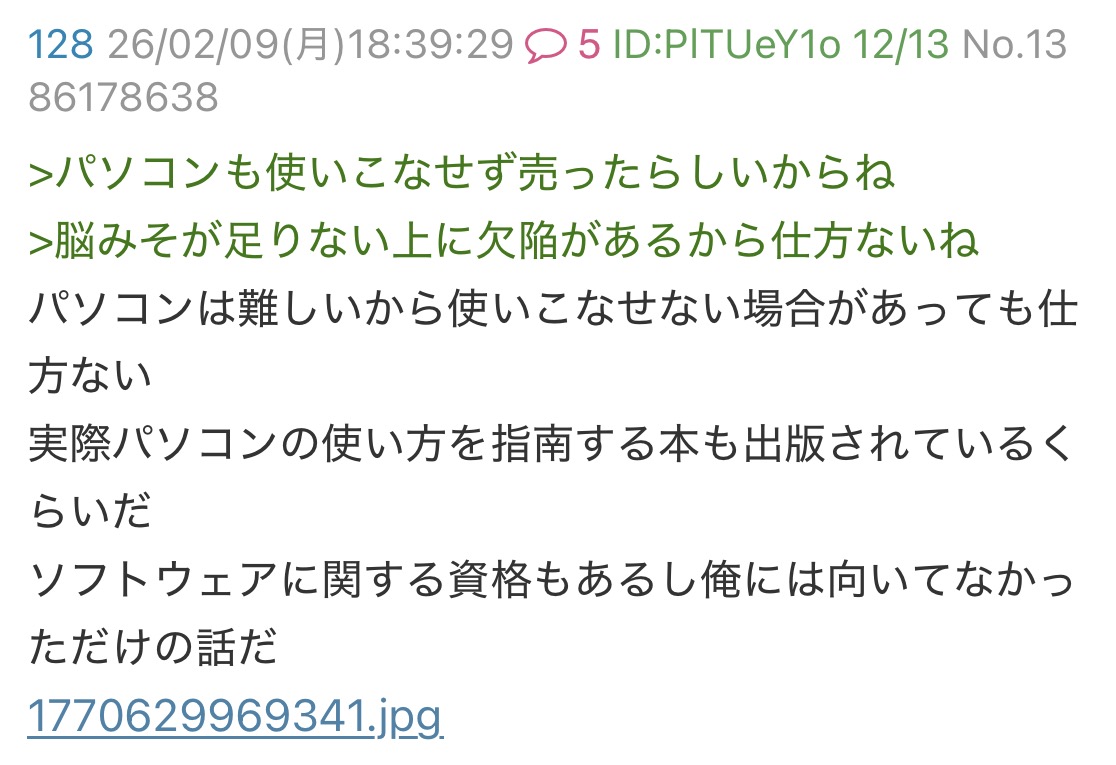 | … | 39無念Nameとしあき26/03/20(金)16:20:20No.1395138204+>能力に対して正当な評価だと思うんだが・・・自分が有能だとでも思ってる? |
