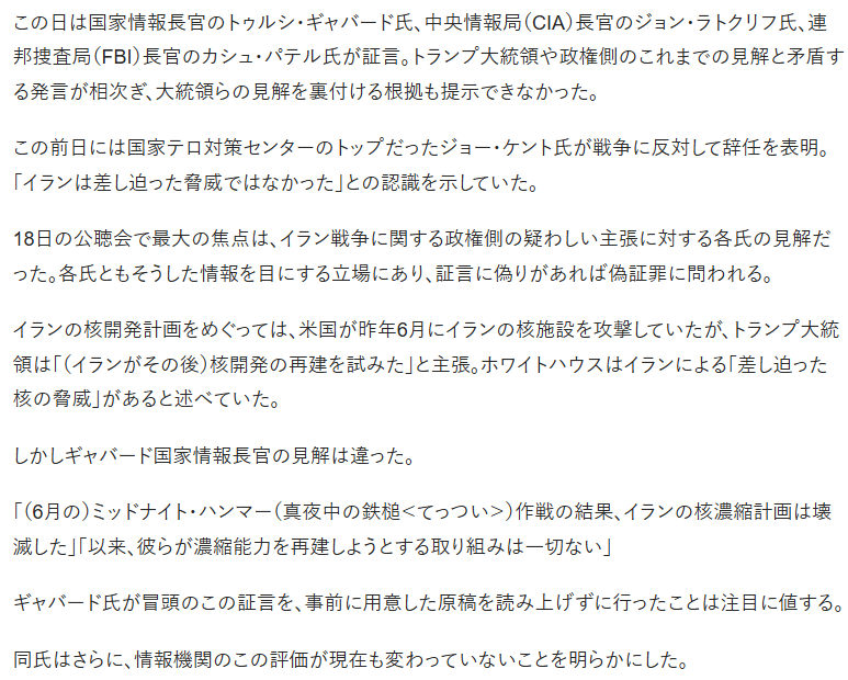 | … | 230無念Nameとしあき26/03/20(金)20:59:32No.1395203960+>アメリカの情報機関という情報機関が6月から今に至るまでイランの核兵器開発機能はなく核兵器開発する動きも見られなかったって証言したからマジで開戦理由は全て嘘っぱちだと判明してる |