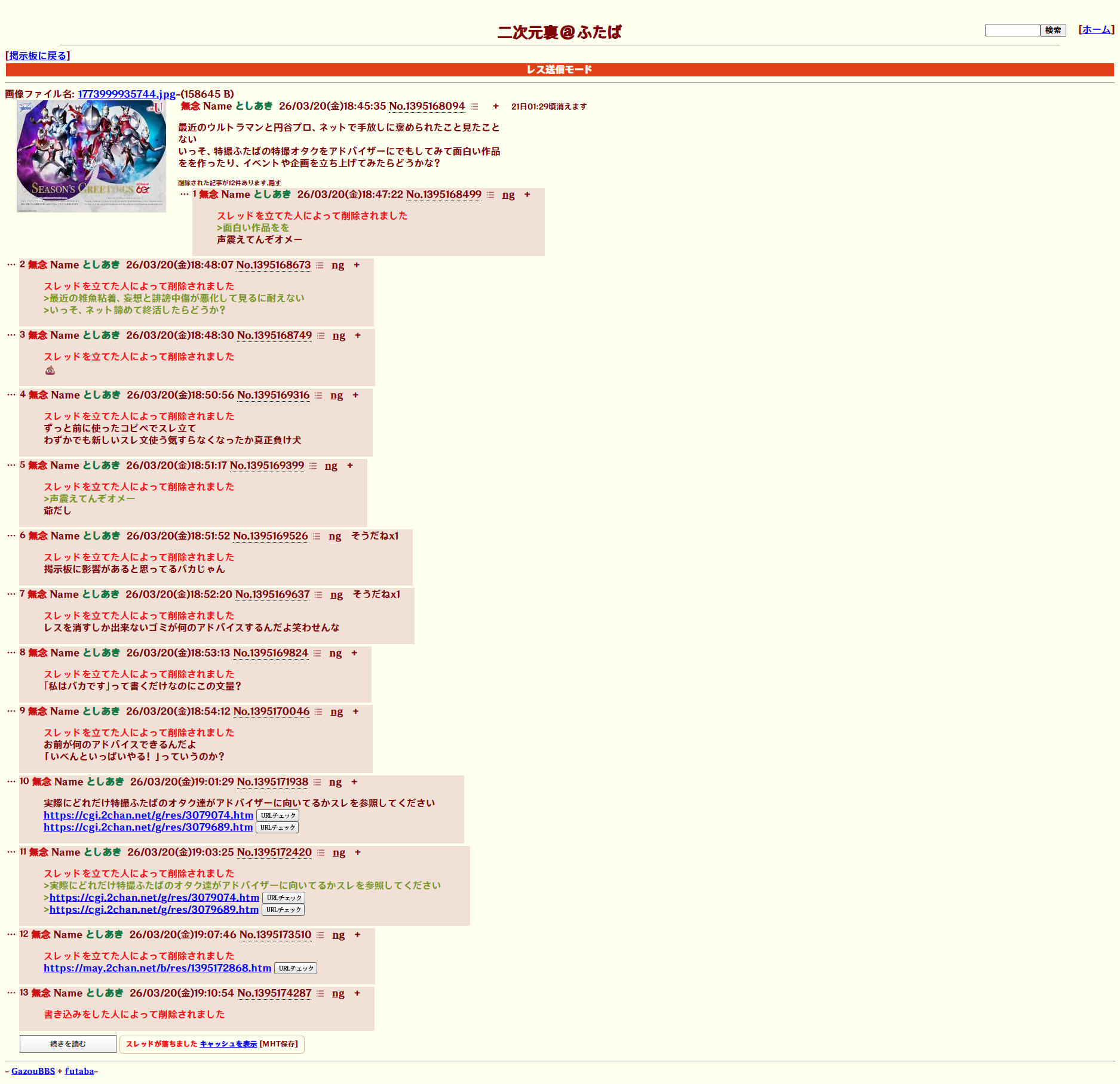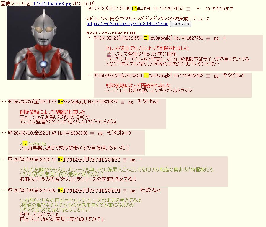 | … | 14無念Nameとしあき26/03/20(金)20:09:19No.1395190012+書き込みをした人によって削除されました |
