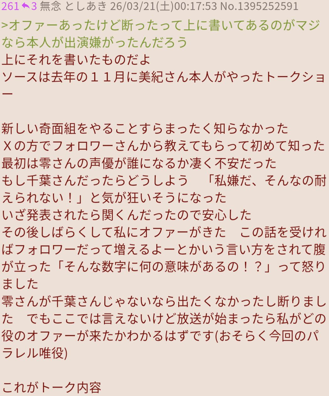 | … | 397無念Nameとしあき26/03/21(土)02:07:33No.1395267372+>千葉さんの声だけ聞きに来て満足したから良かったねって言いに来た |
