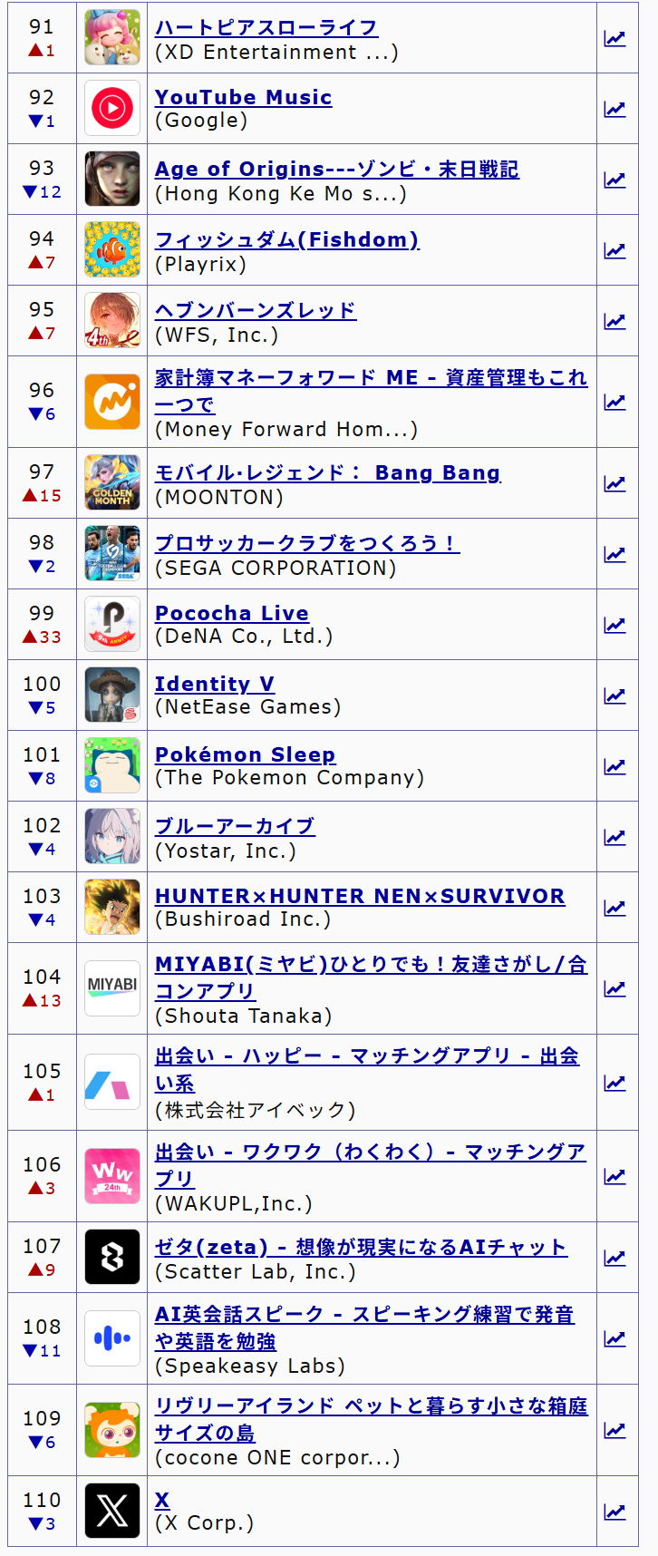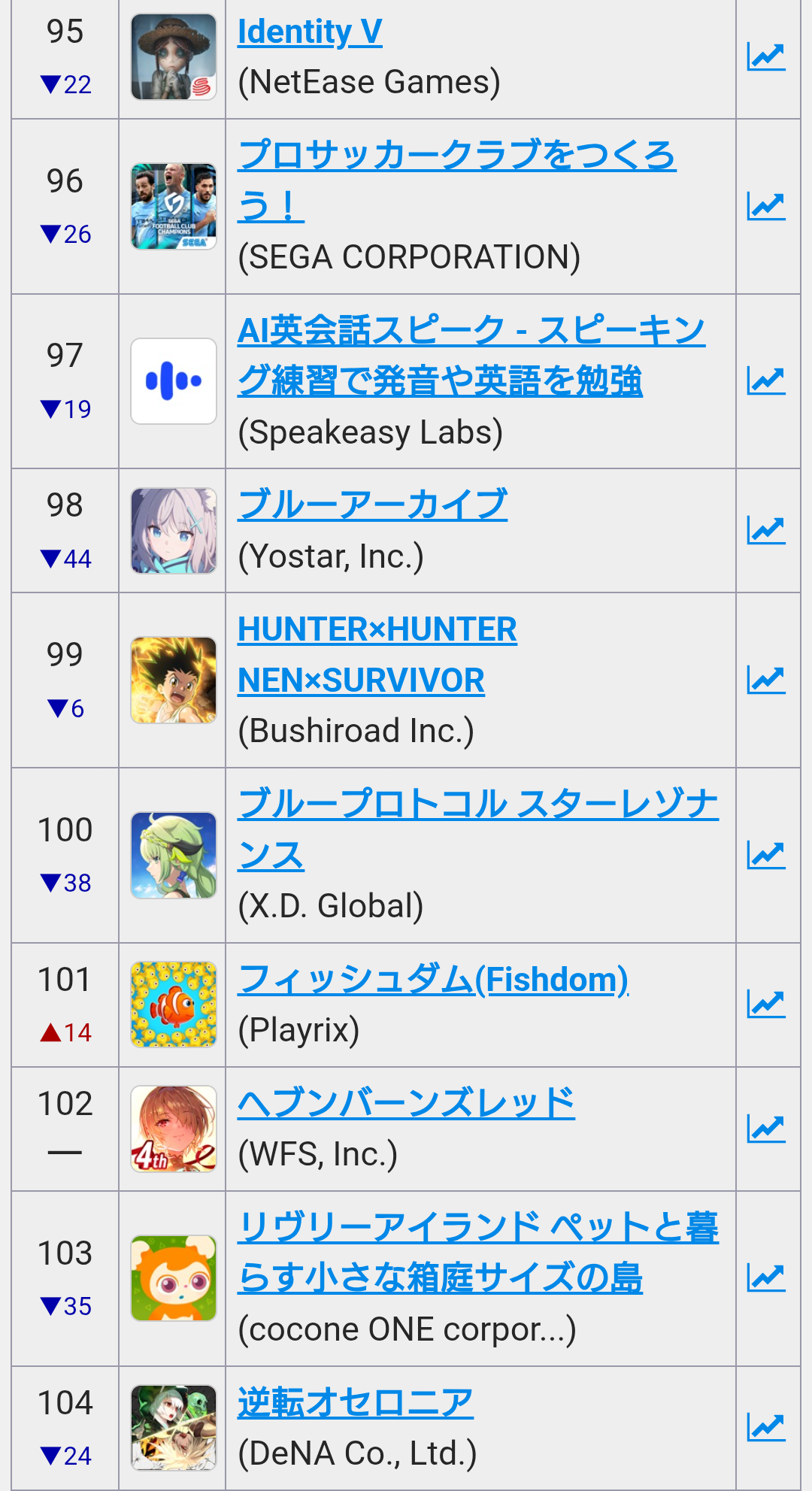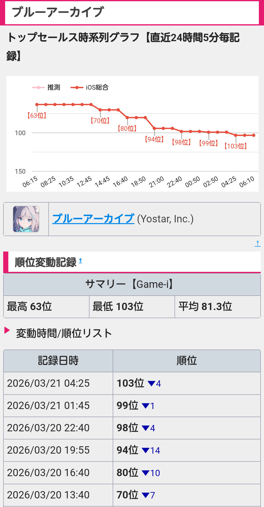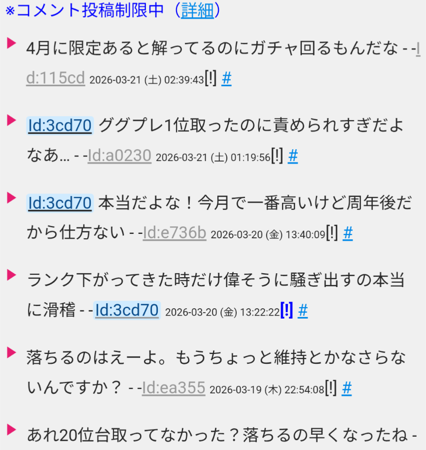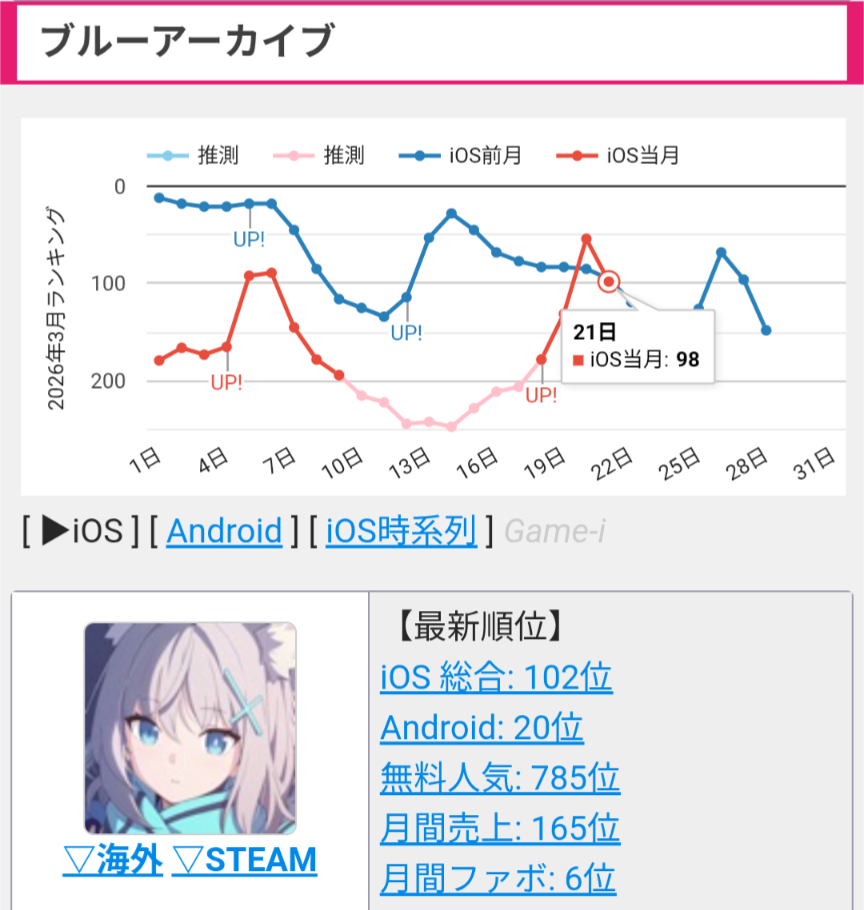 | … | 418無念Nameとしあき26/03/21(土)10:05:11No.1395301718そうだねx1>怨敵はちゃんと順位を維持してるのを見るとやっぱりブルアカのブーストは仮初のものだったんやなって… |
