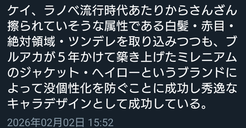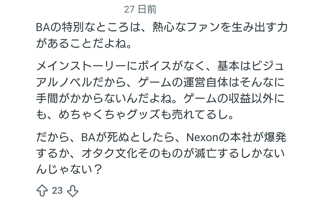 | … | 455無念Nameとしあき26/03/21(土)10:27:32No.1395305441そうだねx3匿名掲示板ではブルアカを賞賛する文章を見るのは少なくなったわね |