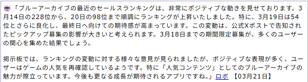 | … | 461無念Nameとしあき26/03/21(土)10:29:10No.1395305752そうだねx2>匿名掲示板ではブルアカを賞賛する文章を見るのは少なくなったわね |