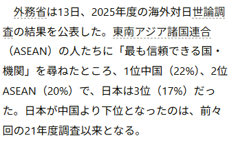 | … | 117無念Nameとしあき26/03/21(土)01:44:35No.1395265289そうだねx4 1774025075303.jpg-(38617 B) >中国の好感度上昇中 |