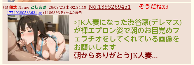 | … | 702無念Nameとしあき26/03/21(土)11:31:46No.1395316093+ 1774060306075.jpg-(100230 B) アイマスでピンサロのシュチをお願い致します |