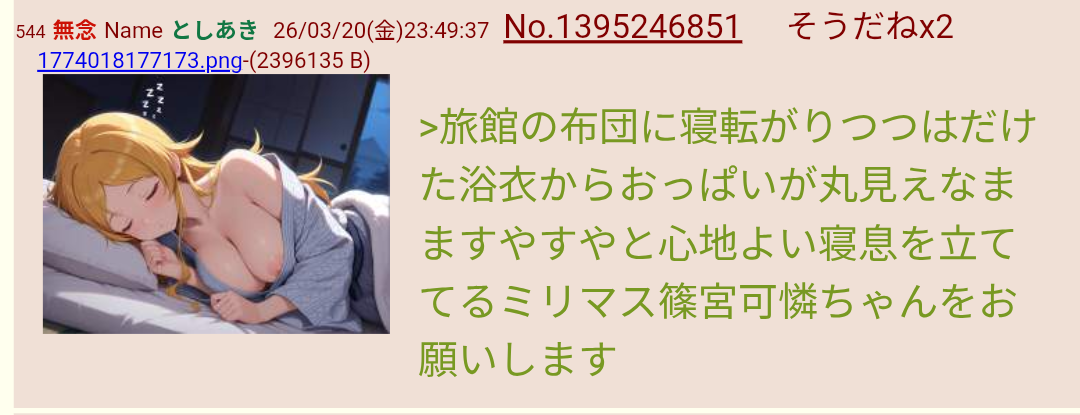 | … | 727無念Nameとしあき26/03/21(土)11:41:12No.1395317833そうだねx2 1774060872793.png-(1580630 B) >この着物の子をロリ巨乳にしてください |