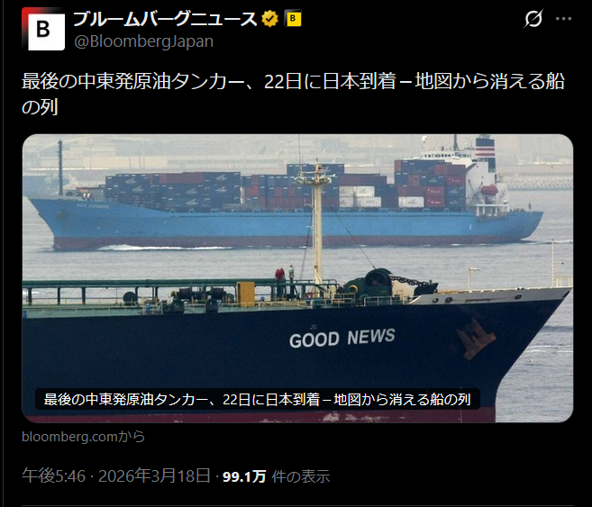 | … | 71無念Nameとしあき26/03/21(土)07:22:24No.1395281653そうだねx2 1774045344862.jpg-(337748 B) 明日で輸入原油を載せた船がラスト |