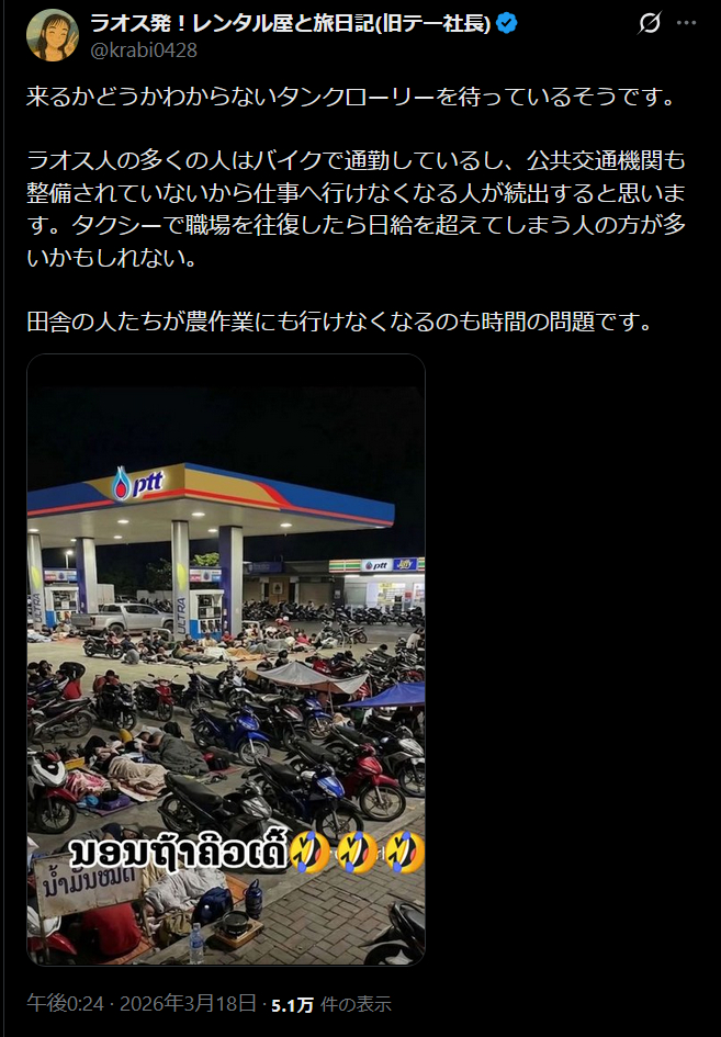 | … | 85無念Nameとしあき26/03/21(土)07:27:30No.1395282050+ 1774045650415.jpg-(550280 B) ラオスではガソリンスタンドで寝泊まりしながらタンクローリー待ち |
