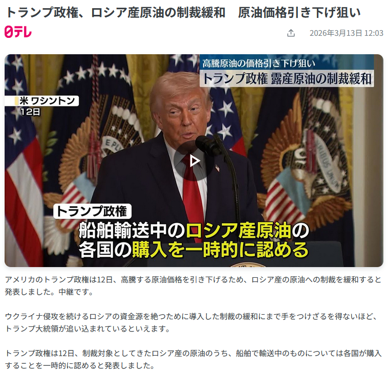 | … | 283無念Nameとしあき26/03/21(土)09:42:14No.1395298039そうだねx3>アメリカが制裁を一時解除してロシア産石油輸入解禁したからな |