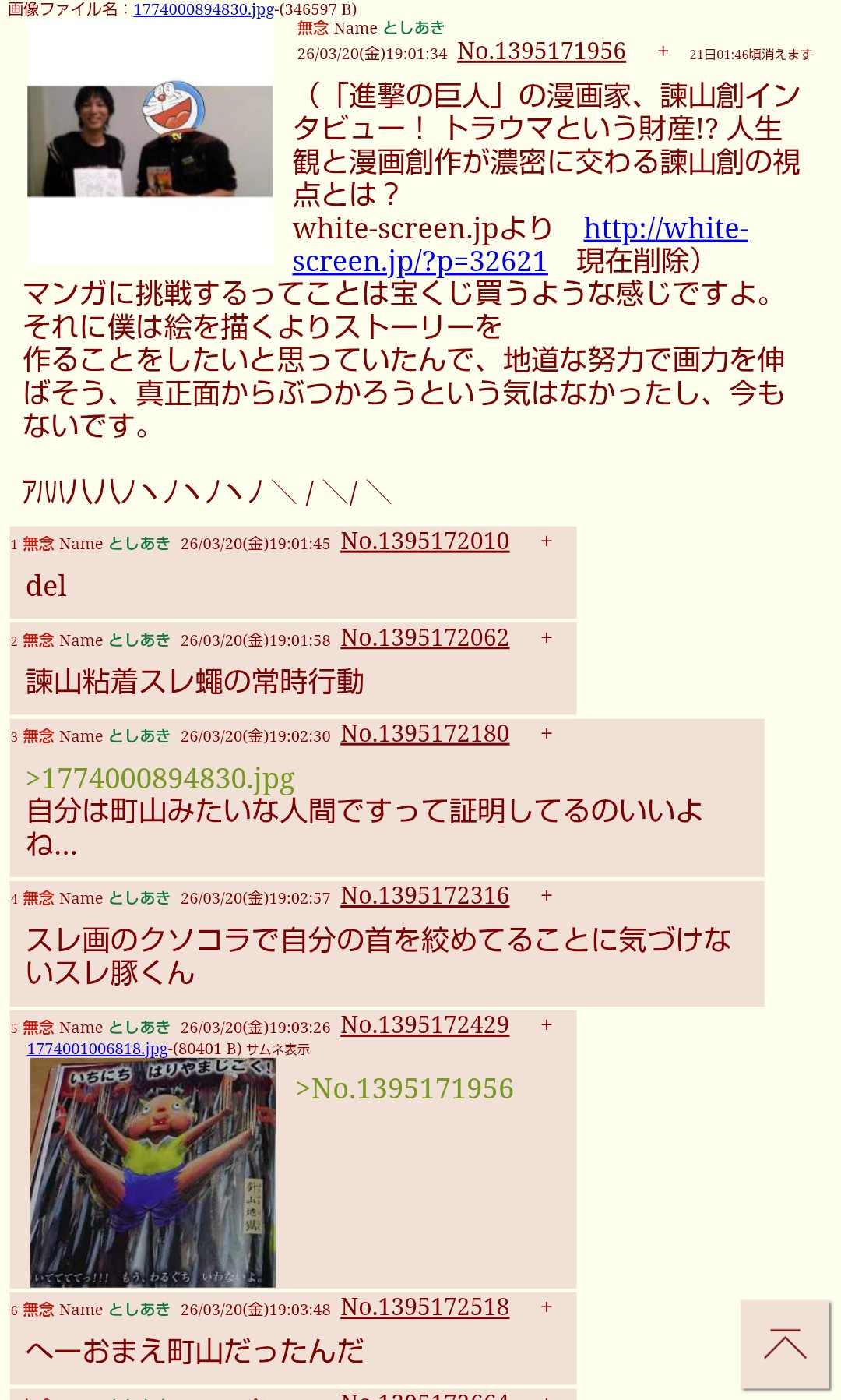 | … | 2無念Nameとしあき26/03/21(土)07:51:25No.1395283911そうだねx3諫山粘着スレ蠅の常時行動 |