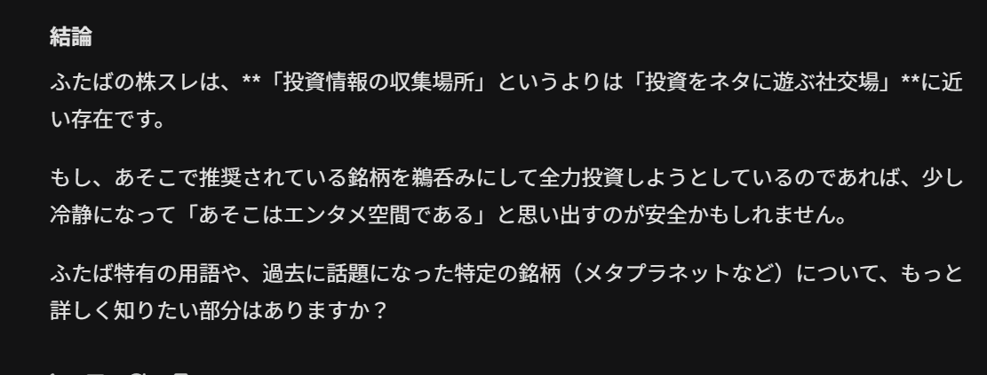 | … | 62無念Nameとしあき26/03/21(土)22:07:13 ID:vX4bqp6QNo.1395459481そうだねx5>この間レスしたら高値掴みした投資家に速攻「死ねよ」とキレられてたの噴いたので |