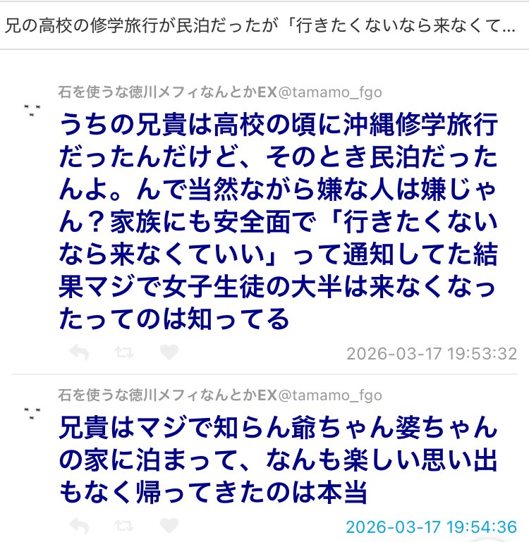 | … | 497無念Nameとしあき26/03/22(日)07:43:37No.1395527174+>>学校側は全力で旅行会社のせいにする |