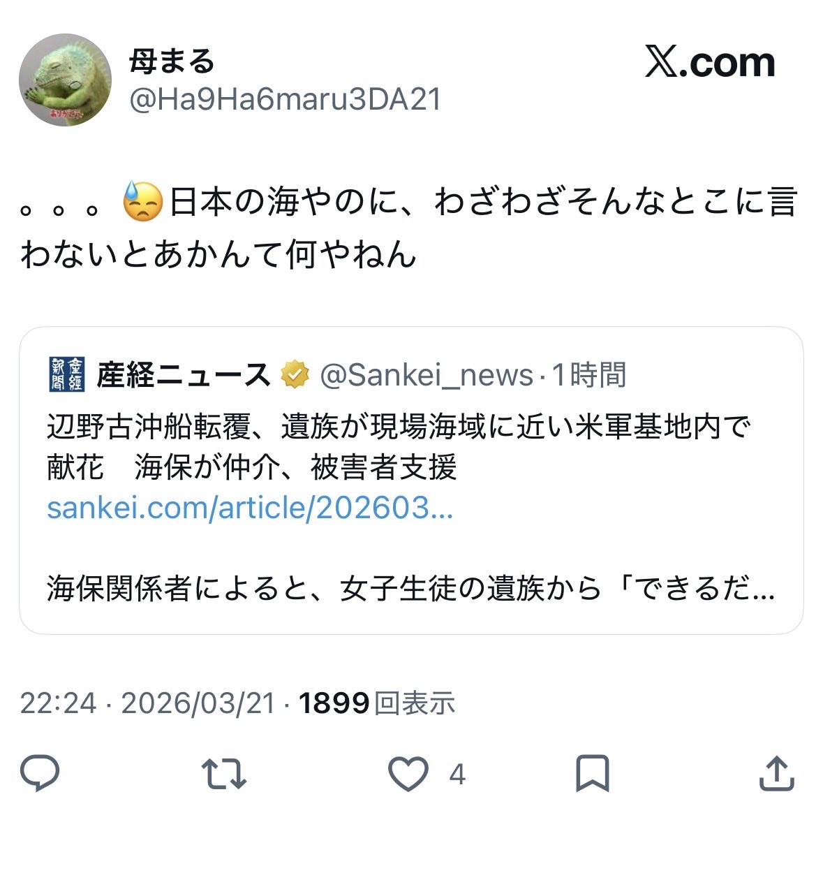 | … | 504無念Nameとしあき26/03/22(日)07:45:54No.1395527384+>まぁ海保からすればパヨクぶん殴っても止めてれば死なせずに済んだ筈の事案だからな |
