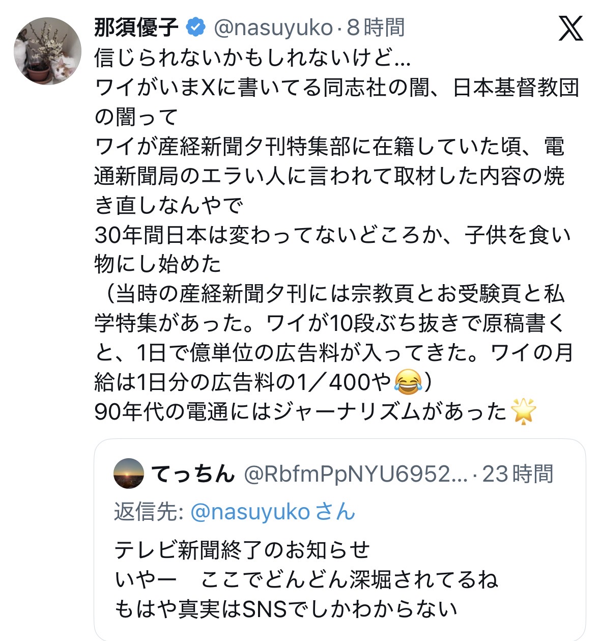 | … | 290無念Nameとしあき26/03/22(日)10:27:01No.1395553812そうだねx2>大体の大手マスゴミは左翼とズブズブなんだなってことを再認識させてくれるのいいよね |