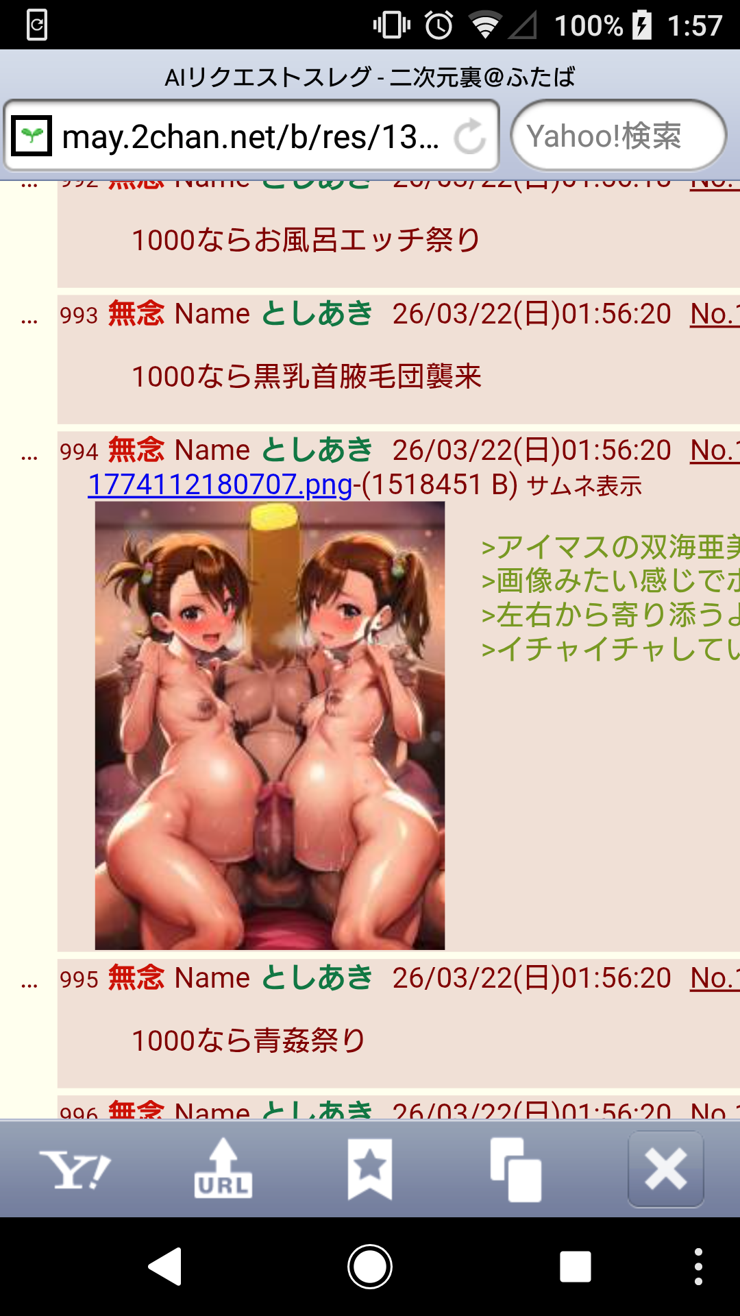 | … | 743無念Nameとしあき26/03/22(日)07:46:22No.1395527435そうだねx1 1774133182696.jpg-(613661 B) >閃乱カグラの両奈か雲雀でマイクロビキニずらしアナルファックをお願いします |