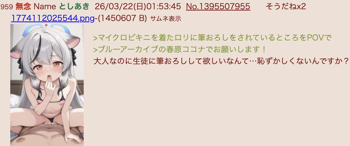 | … | 43無念Nameとしあき26/03/22(日)02:07:37No.1395509796+ 1774112857823.webp-(134280 B) マイクロビキニのブルアカの空崎ヒナをエロマッサージ責めで手マンでイかせている所をお願いします |