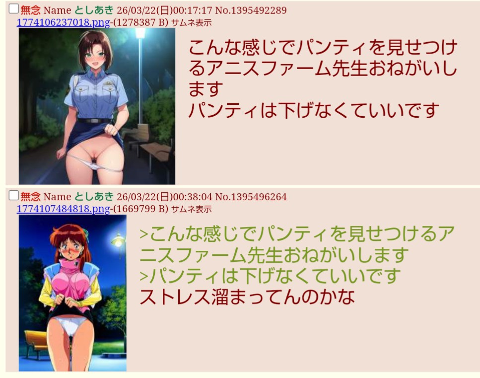 | … | 674無念Nameとしあき26/03/22(日)07:16:36No.1395525084そうだねx2 1774131396895.png-(3251181 B) >デレマスの晴ちんがマイクロビキニを着せられて恥ずかしがってるのお願いします |