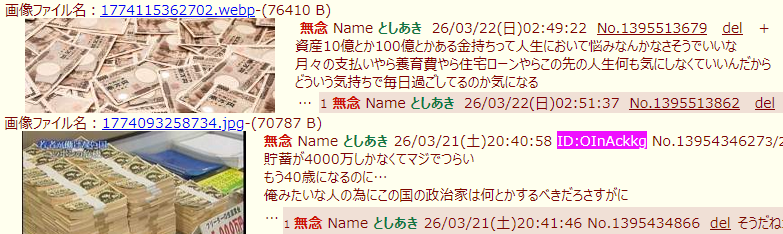 | … | 239無念Nameとしあき26/03/22(日)04:37:43No.1395518857+1億でも十分だよ5000万でも生きていけるよってヤツは実際に金持ってる |