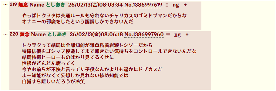 | … | 46無念Nameとしあき26/03/22(日)15:45:25No.1395619106+さっさと特撮板に業界人がいる証拠出せよカス |