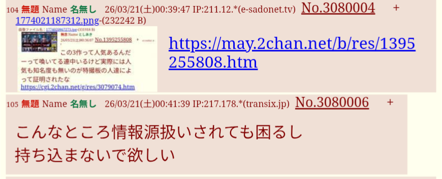 | … | 24無念Nameとしあき26/03/23(月)00:25:22No.1395750517そうだねx8>陰湿極悪雑魚粘着と中華系悪徳雑魚粘着(同一人物)を許すな |