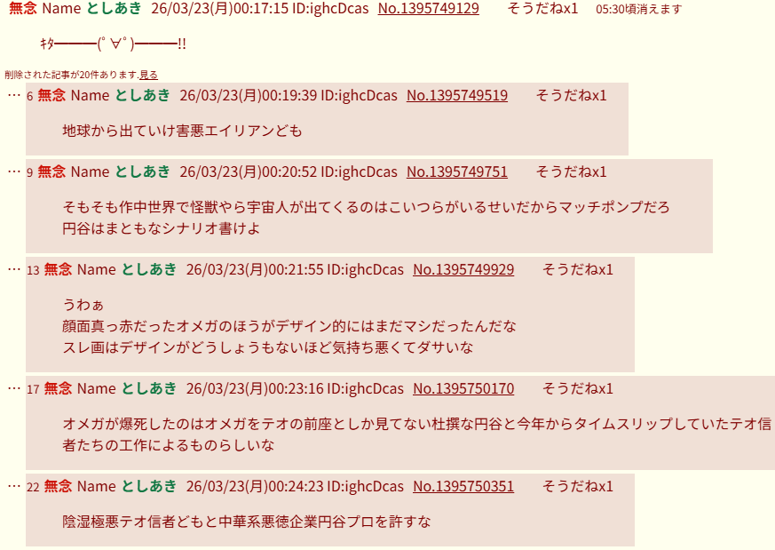 | … | 90無念Nameとしあき26/03/23(月)01:18:12No.1395758248そうだねx5>ウルトラマン、ガンダム、TF粘着は自分ですって自白する理由ってなんなんですかね… |