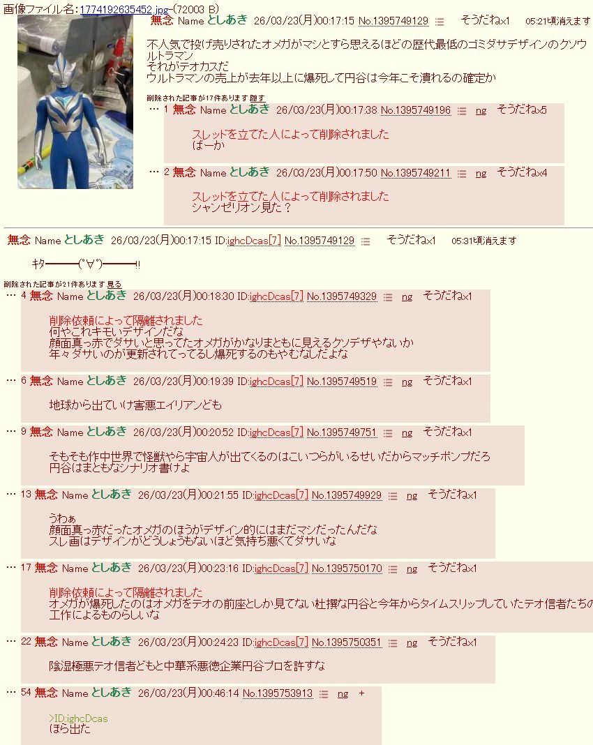 | … | 33無念Nameとしあき26/03/23(月)00:30:56No.1395751471そうだねx2>陰湿極悪テオ信者どもと中華系悪徳企業円谷プロを許すな |