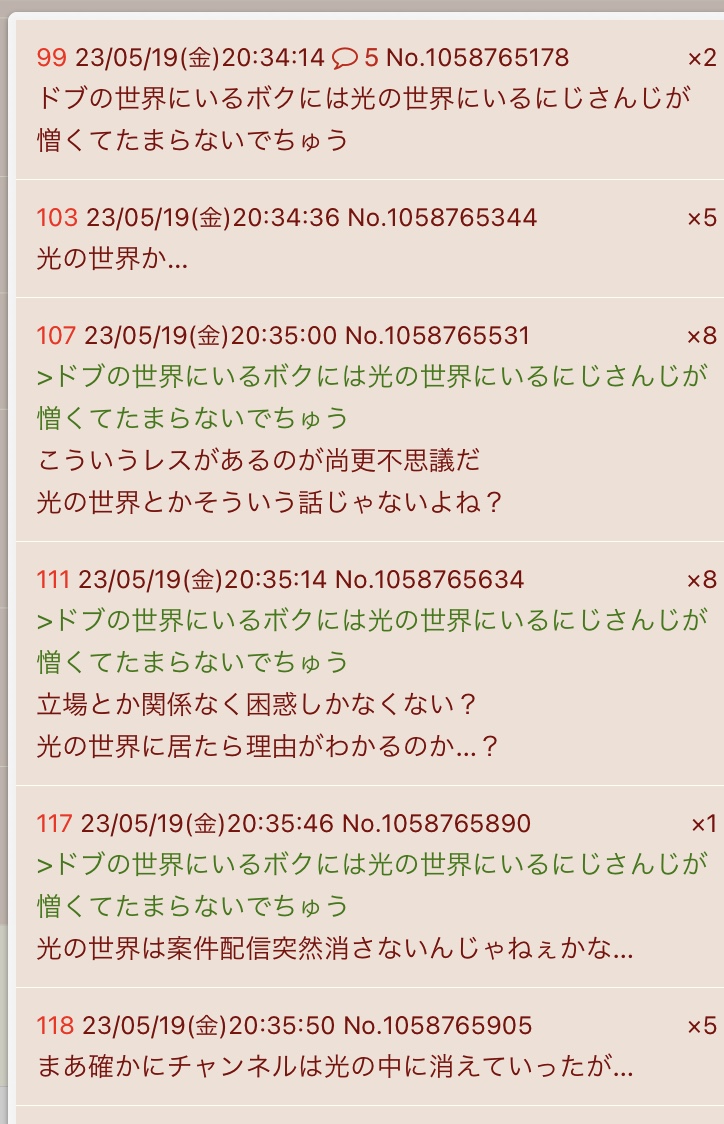| … | 957無念Nameとしあき26/03/23(月)11:45:26No.1395801951+>その場合もバーチャルユーチューバーとまず紹介されるけどいったい全体どこの世界から書き込んでるんだ…… |