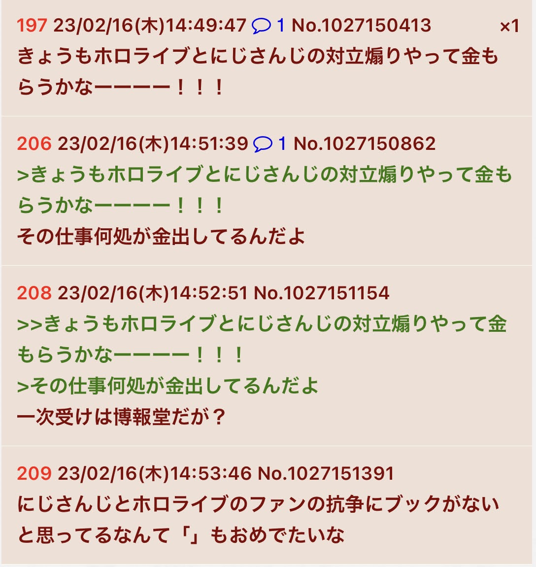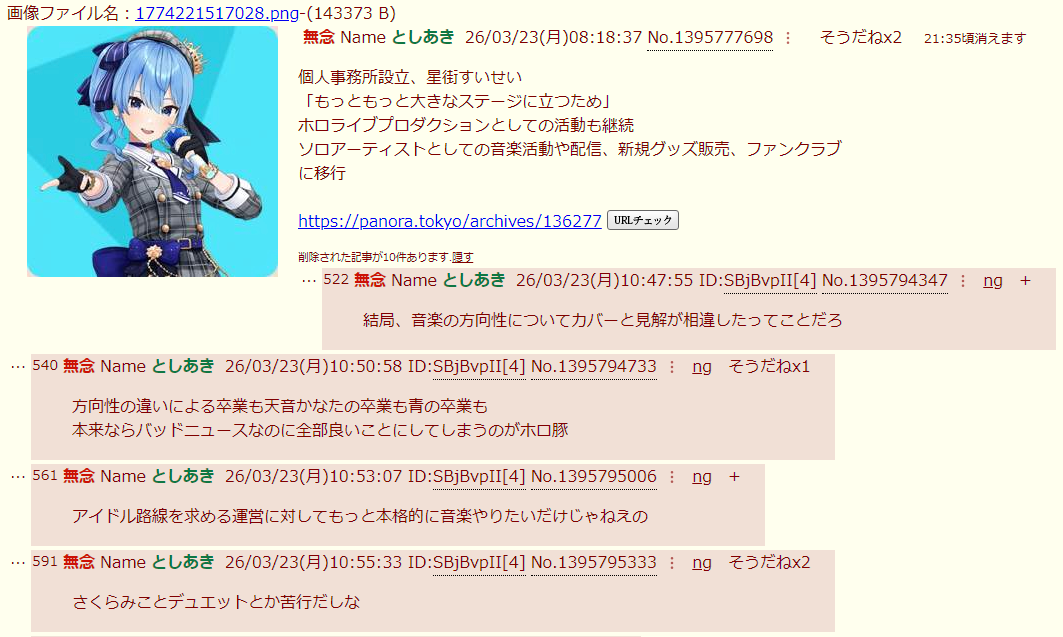 | … | 902無念Nameとしあき26/03/23(月)11:39:33No.1395801098+ホロファンは極端な箱推し思考だから別の事務所の名前が出てきたらどうなるかなってのはある |