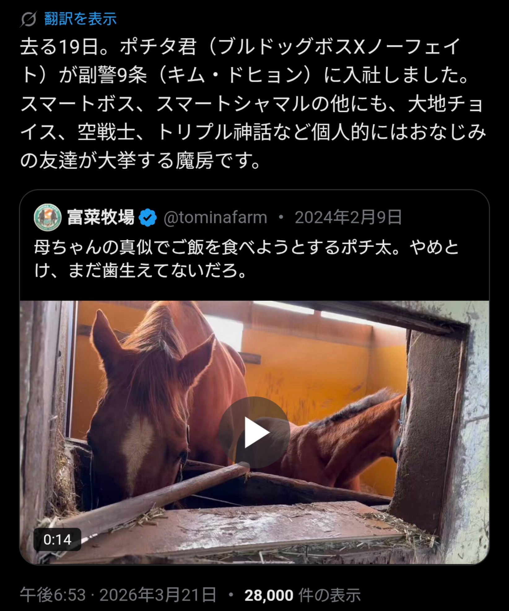 | … | 80無念Nameとしあき26/03/23(月)13:07:56No.1395817021そうだねx2そんなとんでもねえ馬が寂れた牧場でバナナ食ってムヒョムヒョしていたらしいポン |