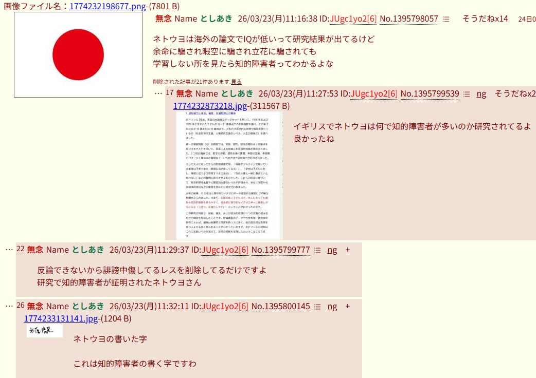 | … | 46無念Nameとしあき26/03/23(月)11:45:47No.1395802002そうだねx4反論できない知的障害者が20件も削除してる… |