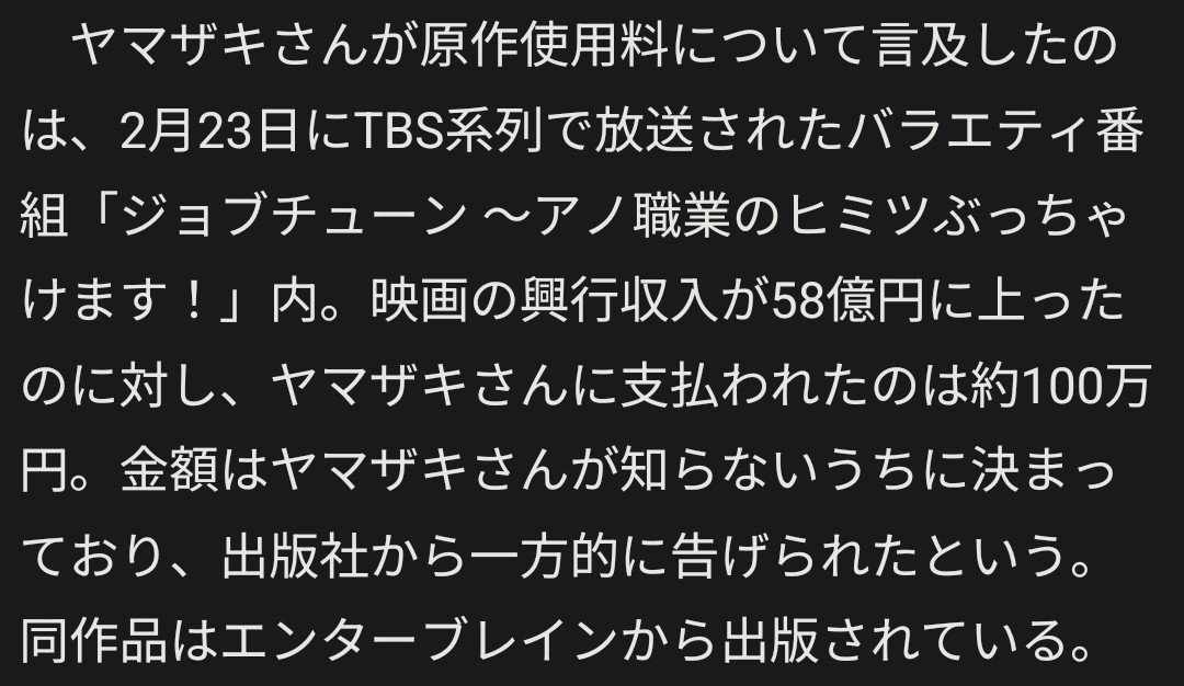 | … | 10無念Nameとしあき26/03/23(月)12:43:42No.1395812613そうだねx4映画がいくら売れても原作者に入る金はちょびっとだって言われてる |