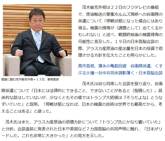 | … | 55無念Nameとしあき26/03/23(月)20:42:44No.1395899534そうだねx3>>日本の自衛隊派遣取り付けたとか発言しだしたからな… |