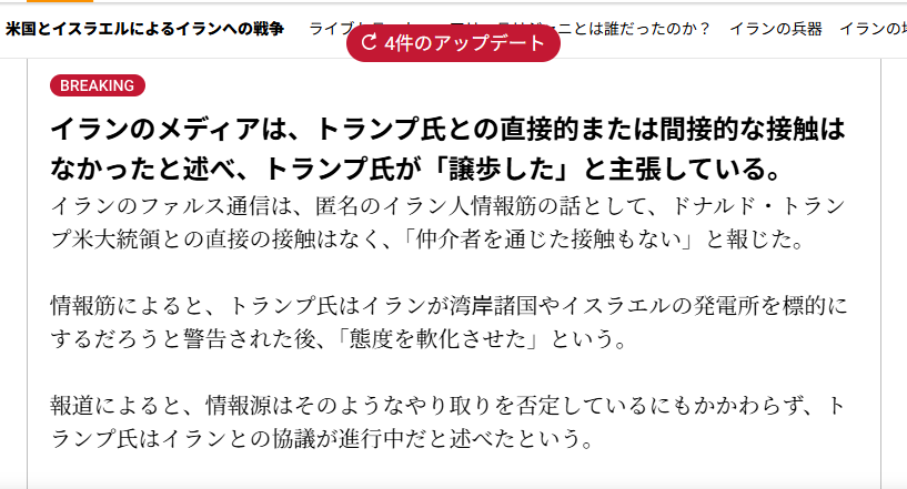| … | 58無念Nameとしあき26/03/23(月)20:43:06No.1395899655そうだねx12これ開戦時と同じで5日待たずにまた攻撃するんじゃないの |