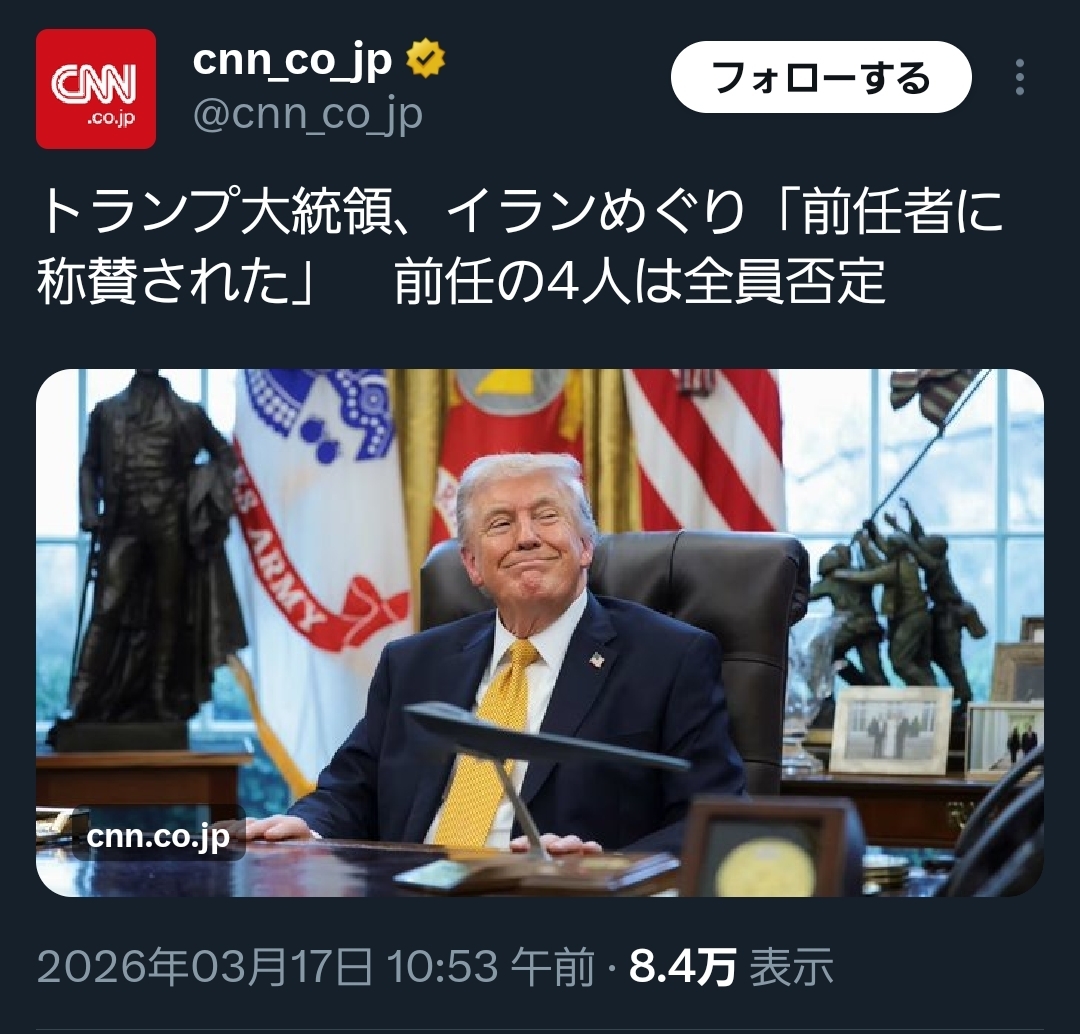 | … | 41無念Nameとしあき26/03/23(月)20:41:17No.1395899102+>トランプの事だから適当ぶっこいてるだけの線も相当でかいのがめんどくさい |
