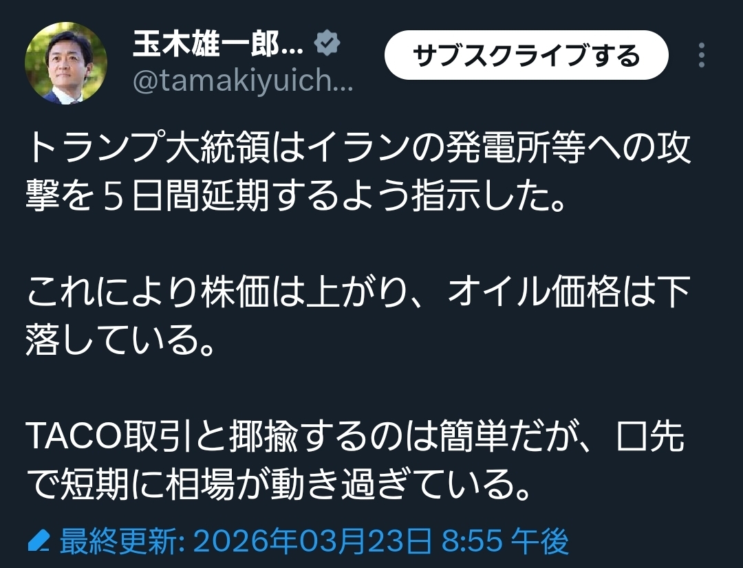 | … | 20無念Nameとしあき26/03/23(月)20:38:18No.1395898234そうだねx25トランプの事だから適当ぶっこいてるだけの線も相当でかいのがめんどくさい |